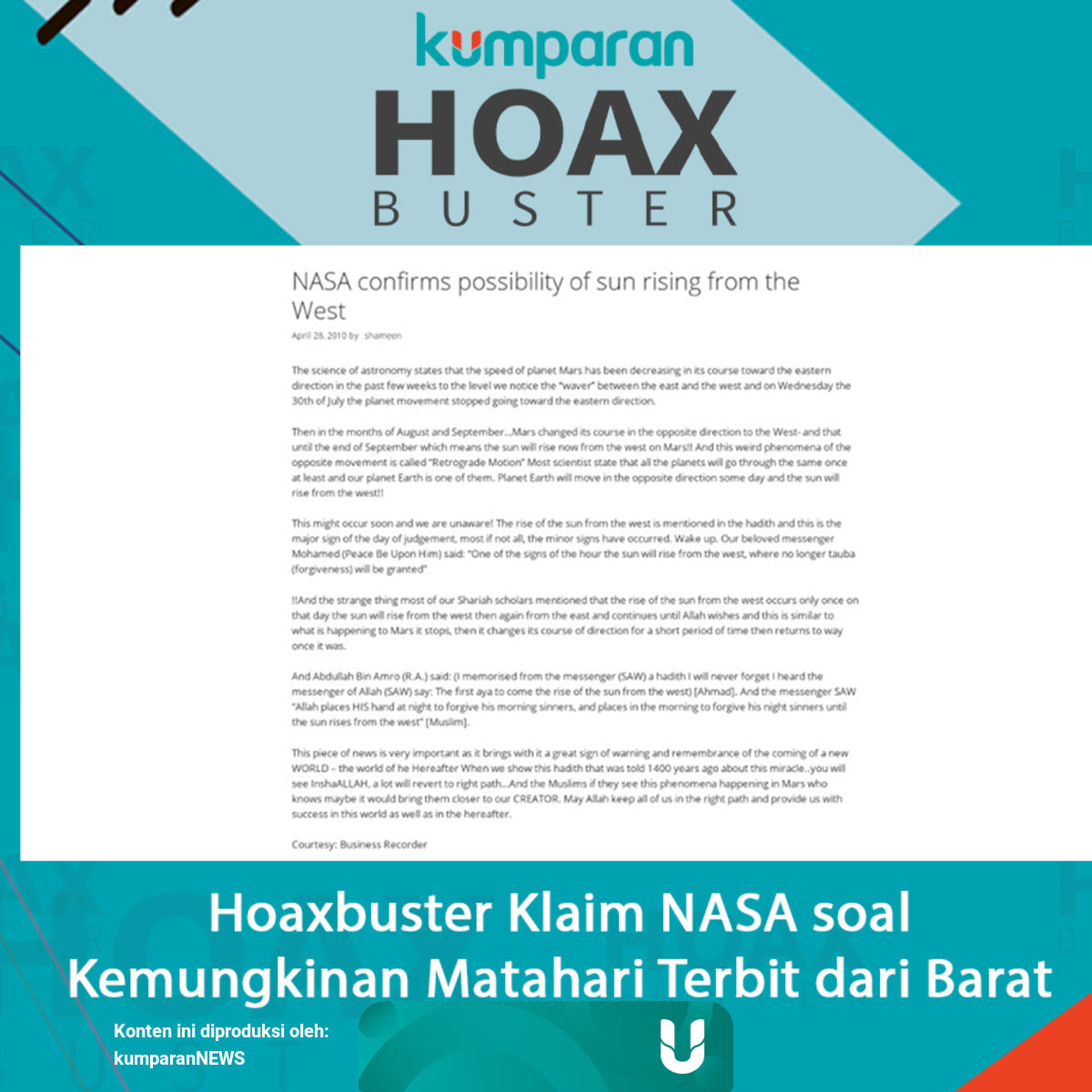 TRIBUNJABARCOID - Kebenaran ajaran Islam terus menerus dibuktikan oleh penemuan demi penemuan ilmu pengetahuan dan sains. Seribu empat ratus 1400 tahun yang lalu Rasulullah SAW sudah menyatakan dalam haditsnya kelak matahari akan terbit dari barat sebagai bukti keagungan. Hoaks tersebut berjudul NASA Membenarkan Matahari Akan Terbit dari Barat.